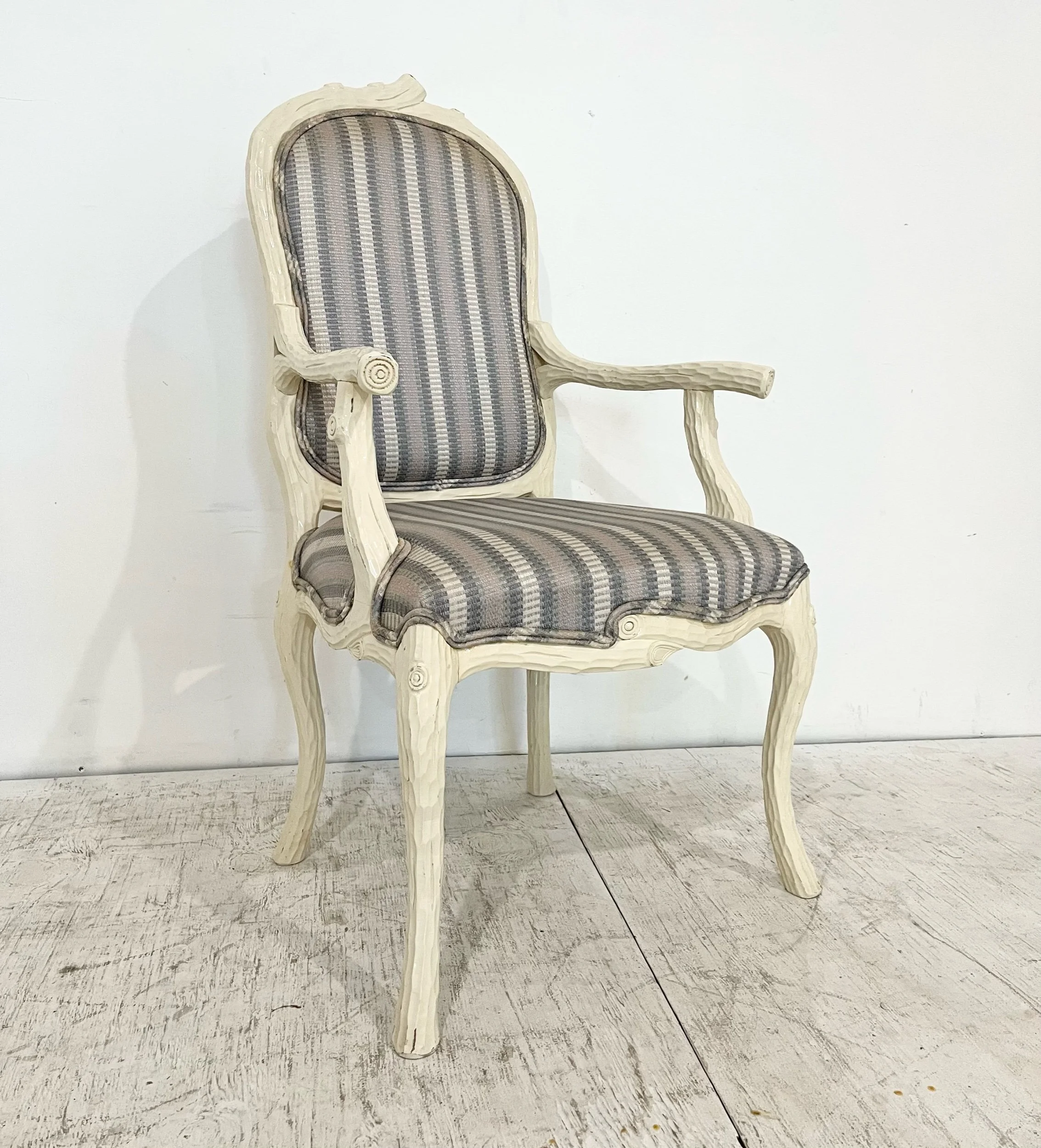 Vintage set of 6 upholstered faux bois dining chairs. Four side chairs and two arm chairs. French Louis XVI bergere style carved wood frames with upholstered seats and backs. Frames carved to look like wooden twigs and branches. A classic set just waiting to be brought back to life.